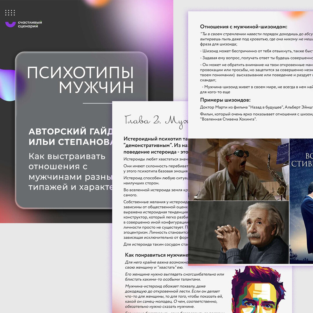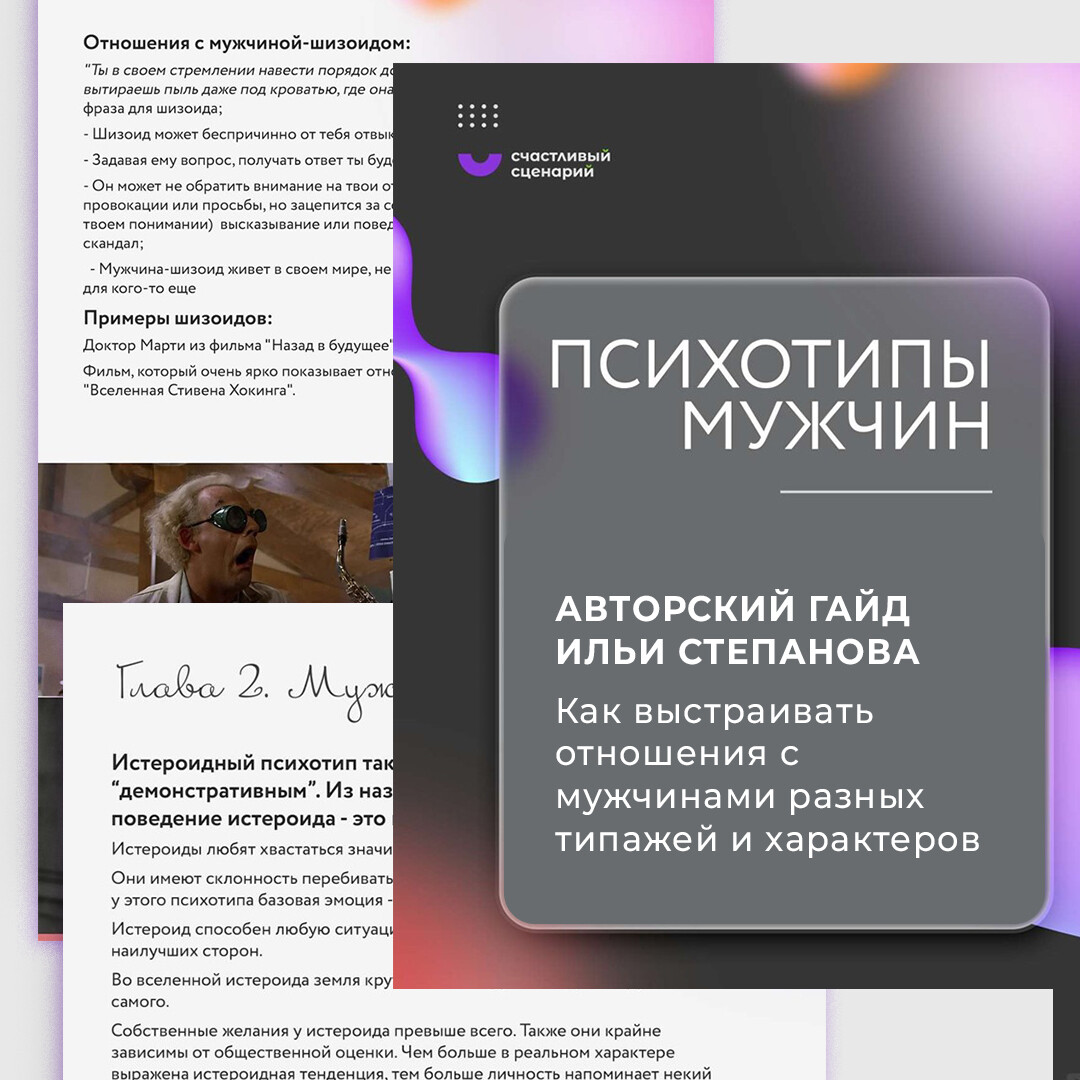 Гайд «Психотипы мужчин» — ключ от всех дверей для создания счастливых отношений. Теперь вам хватит и пары секунд, чтобы понять — что за мужчина перед вами и как с ним общаться, как расположить к себе любого и выстраивать отношения так, чтобы мужчина делал то, что хочется вам